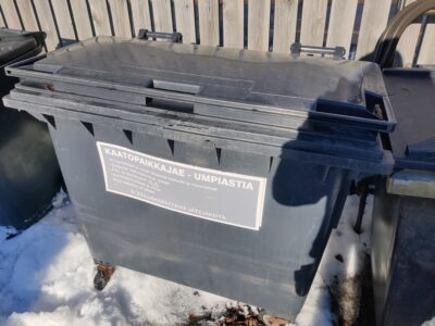 Käytettyjä 660 litran jäteastioita, kuvissa jäljellä olevat kappaleet.