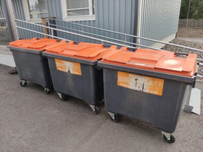 Käytettyjä 660 litran jäteastioita, väreinä oranssi, musta, vihreä. Oranssi 17kpl Tumman harmaa 8kpl 3kpl harmaa jossa oranssi kansi 1kpl musta 4kpl vaalean harmaa 1kpl vihreä