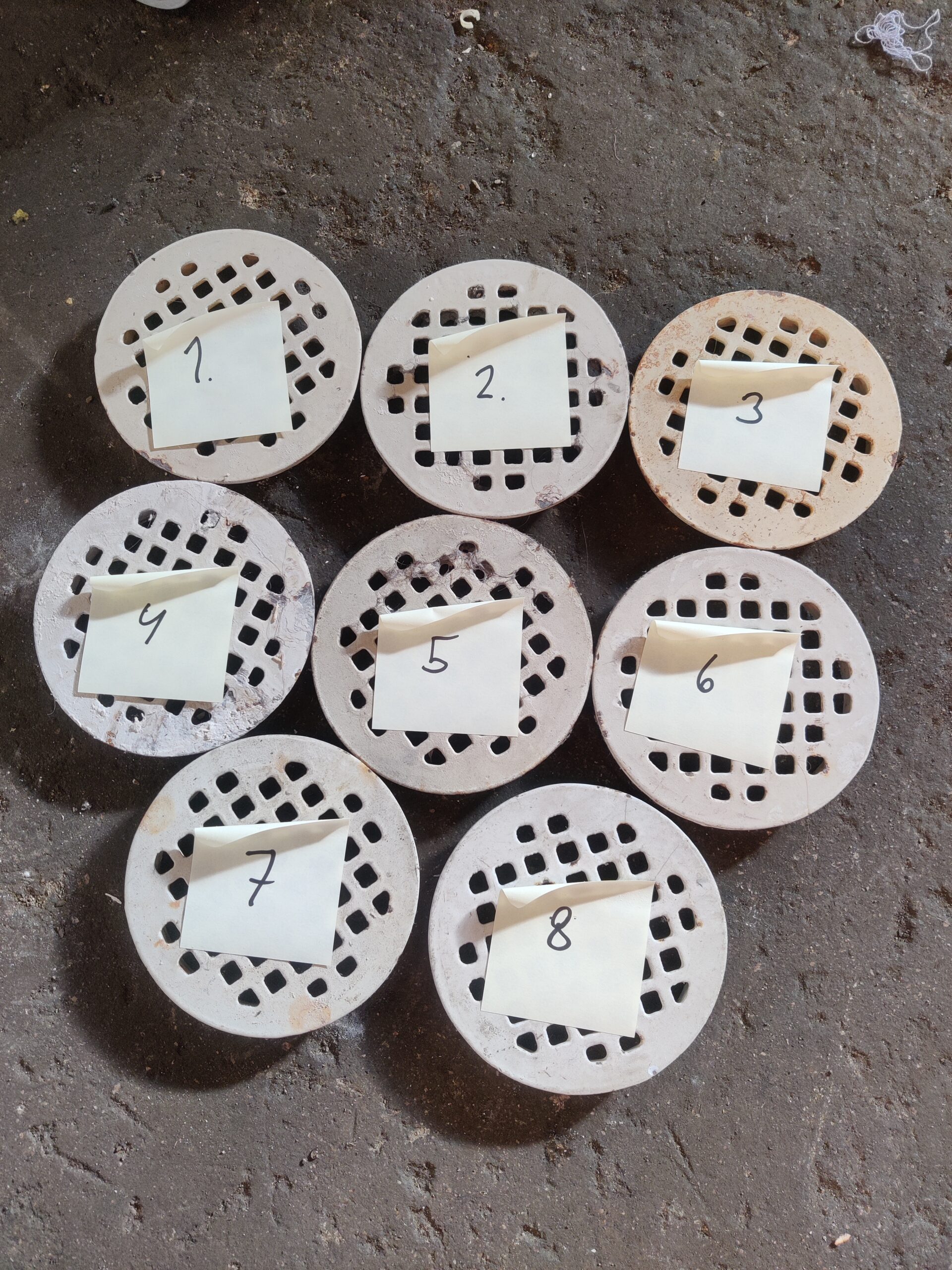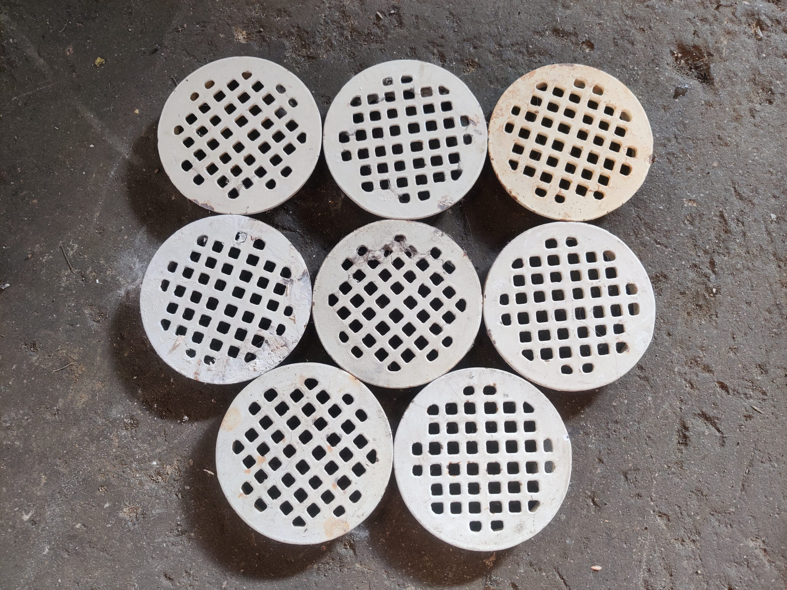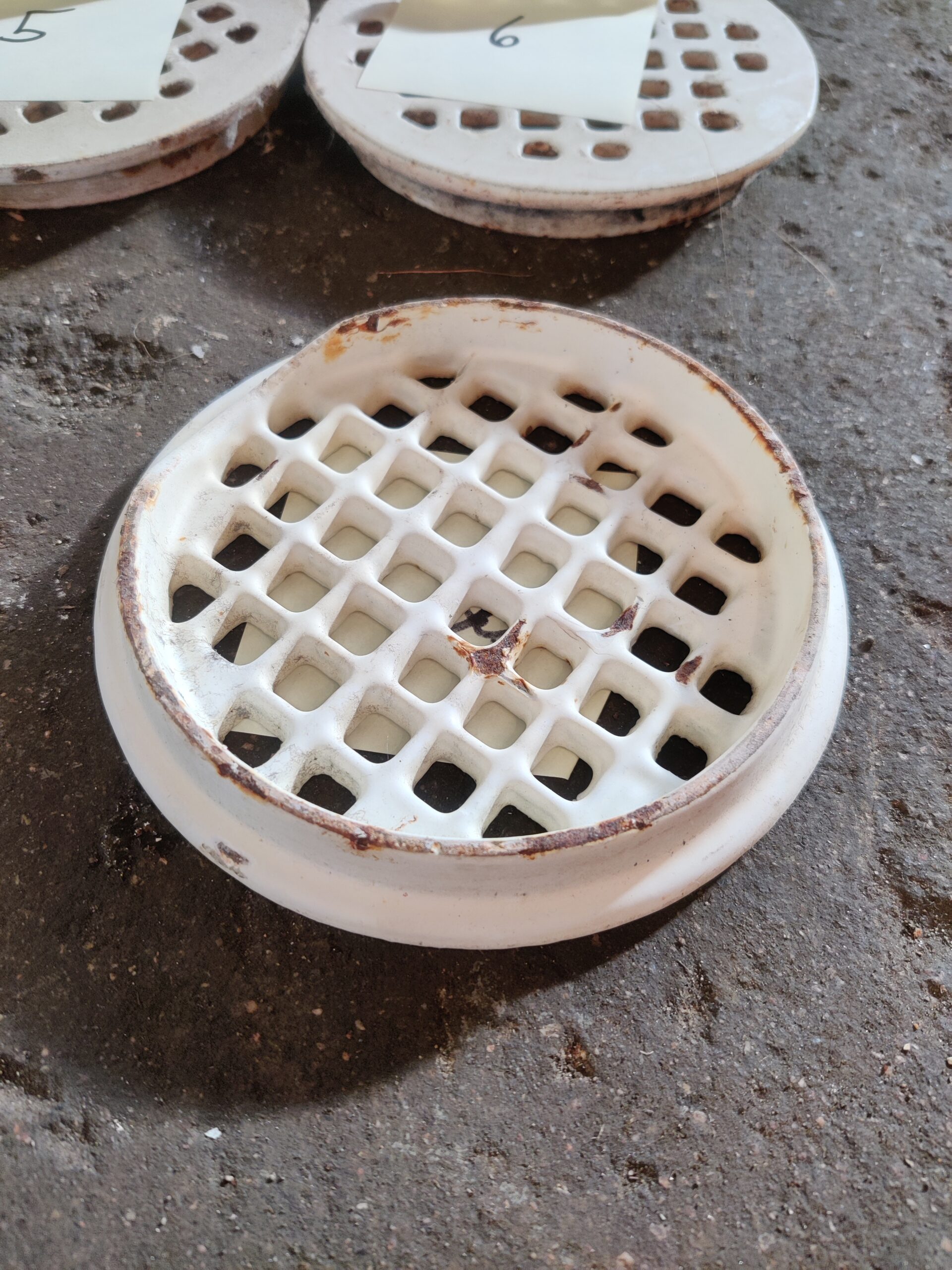 Emalipintaisia kaivonkansia, halkaisija 150mm. Numeroissa 9&10 ei pohjassa kaulusta.