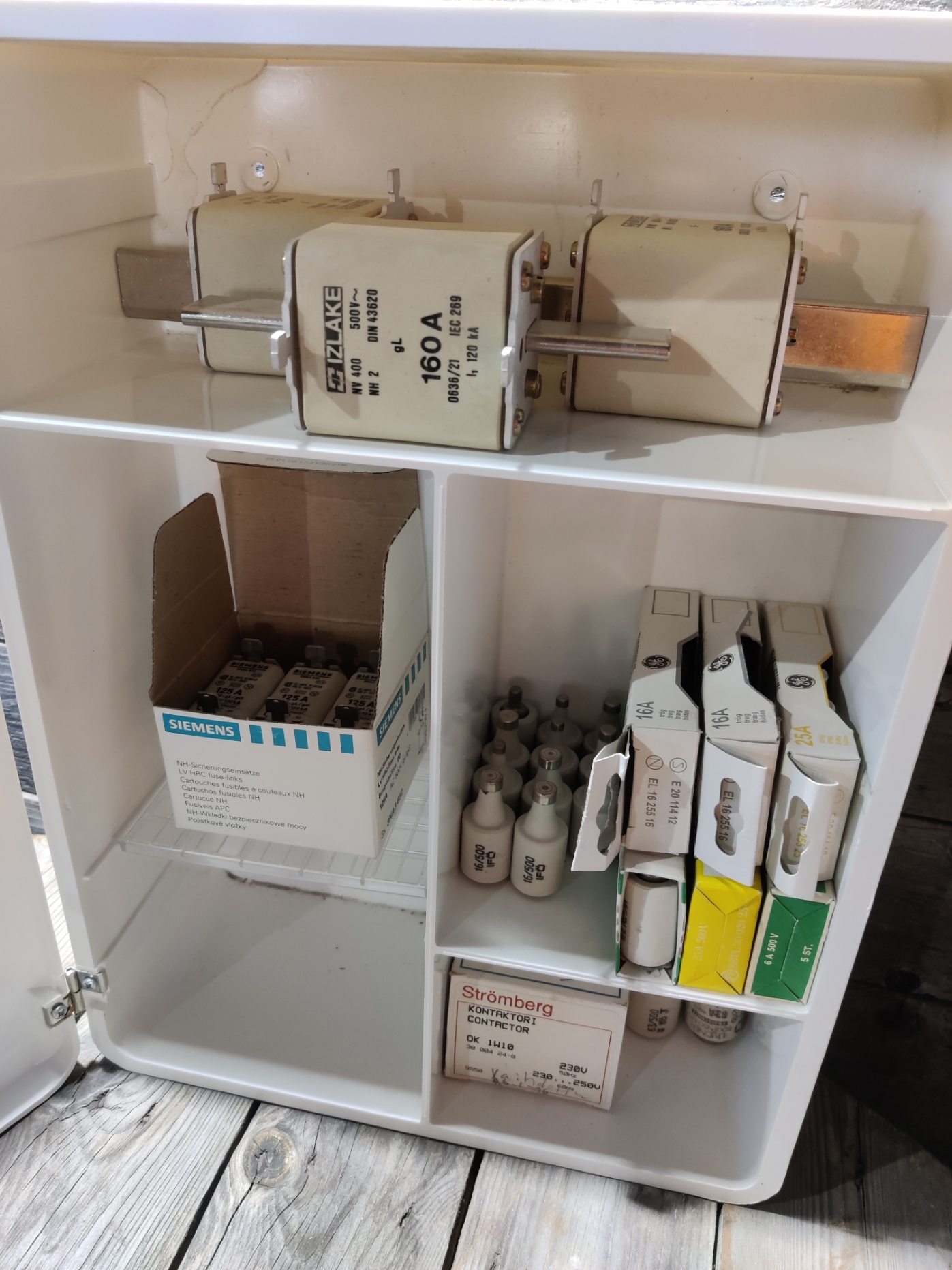 Sähkötilan seinäkaappi, kaapin sisältö kuuluu kauppaan sekä kiinnitysruuvit.